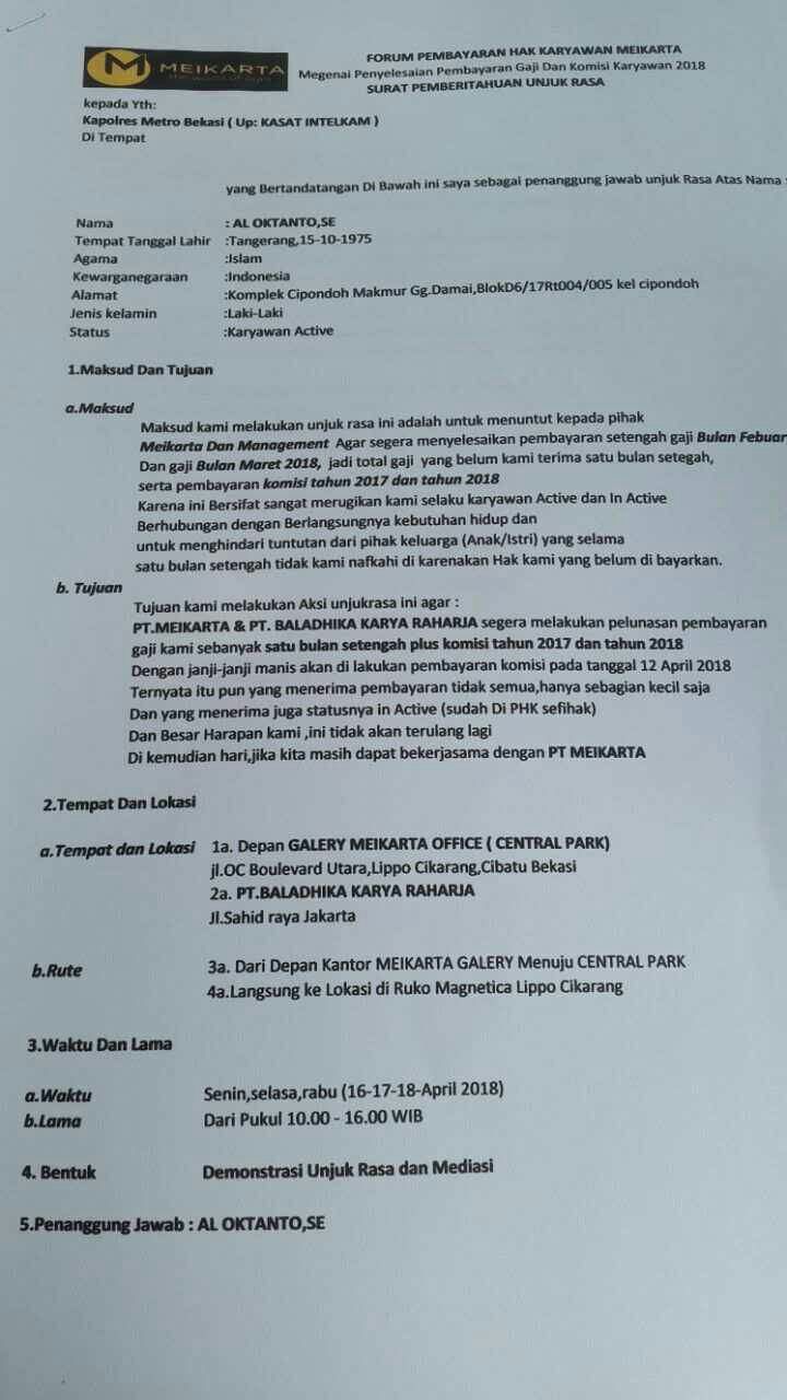 “Tujuan kami melakukan aksi unjuk rasa ini agar PT. Meikarta dan PT. Baladhika Karya Raharja melakukan pelunasan pembayaran gaji yang belum kami terima, sebanyak satu bulan setengah, setengah gaji Bulan Februari 2018 dan gaji bulan Maret 2018, serta pembayaran komisi tahun 2017 dan tahun 2018, ” kata Al Oktanto, penanggungjawab unjuk rasa ini.