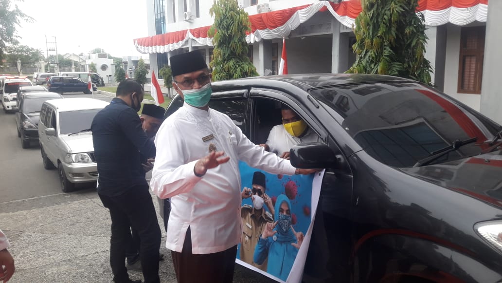 Puncak acara Gebrak Masker dilanjutkan pengibaran bendera start oleh Bupati Bireuen, Dr H Muzakkar A gani, SH, M.Si sebagai tanda pelepasan sejumlah kenderaan yang berkonvoy, yang sebelumnya telah dipasangi striker “Gebrak Masker Aceh.