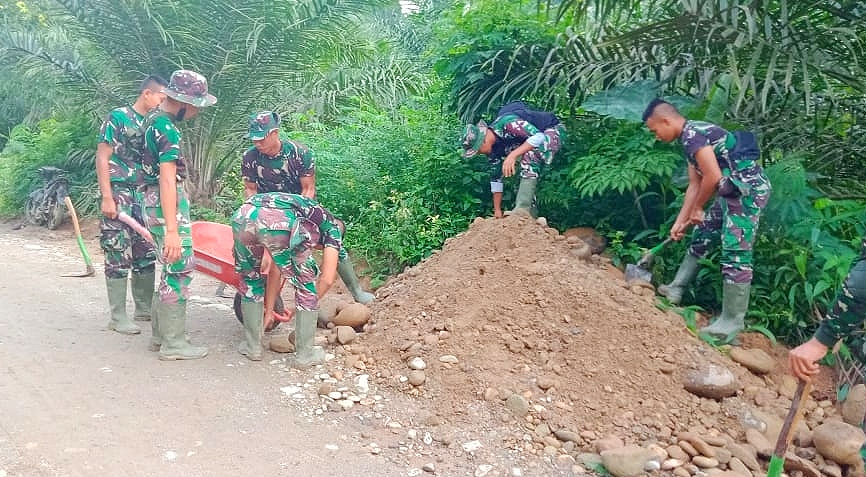 Mengetahui kondisi ini, Senin (12/7/2021) pagi, anggota Satgas TMMD 111 Kodim 0204/Deliserdang pun langsung turun ke lokasi melakukan penimbunan dan pemadatan kembali menggunakan tanah uruk dan batu koral.
