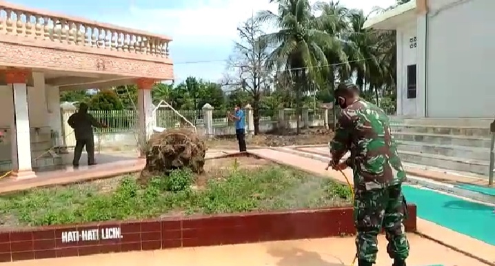 Lhokseumawe – Personel Kompi 1 Batalyon B Pelopor bersama TNI dari Koramil Kutablang Kecamatan Bireuen kembali melaksanakan penyemprotan disinfektan di Mesjid Al Ikhlas Kecamatan Kutablang Kabupaten Bireuen.
