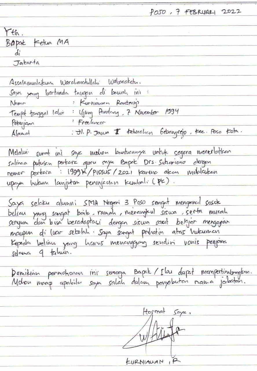 JAKARTA | bongkarnews.com – Sebanyak 95 siswa SMA Negeri 3 Poso bersama 14 orang alumni sekolah ini mengirimkan surat permohonan kepada Ketua Mahkamah Agung (MA) agar kiranya MA segera memberikan salinan putusan kasasi atas vonis 4,5 tahun penjara yang ditimpakan kepada guru mereka Drs. Suhariono. Turut juga mengirimkan surat permohonan ke Ketua MA, 2 orang rekan guru SMAN 3 Poso, atas nama I Putu Sudama (51) dan Hendro Firgiawan Fristanto (31).