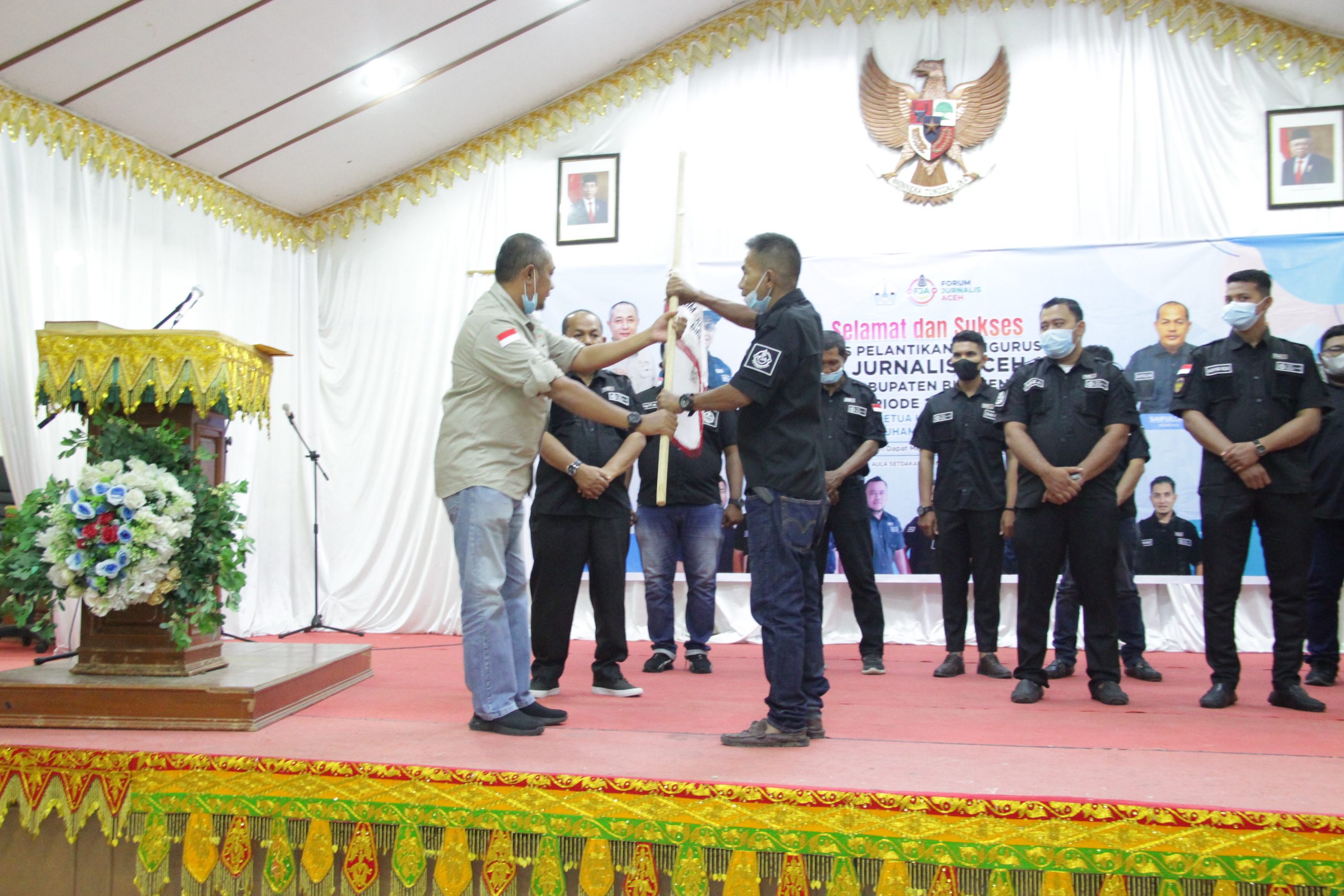 Acara pelantikan pengurus FJA Bireuen, ditandai penyerahan Pataka yang diserahkan Ketua umum FJA Pusat, H Muhammad Saleh yang diterima Ketua Umum FJA Bireuen, Maimun Mirdaz. Dalam penyerahan pataka turut didampingi Pembina FJA Bireuen, Saifullah, ST serta pengurus lengkap lainnya.