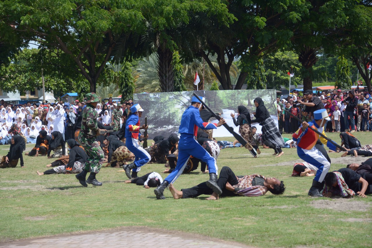 Drama yang dimainkan oleh prajurit TNI jajaran Korem 011/Lilawangsa dan sejumlah Siswa SMA Kecamatan Banda Sakti Kota Lhokseumawe, dalam rangka memperingati dan memeriahkan Hari Kemerdekaan Republik Indonesia Ke -72 Tahun, berlangsung di Lapangan Hiraq Kota Lhokseumawe, Kamis (17/8/2917).