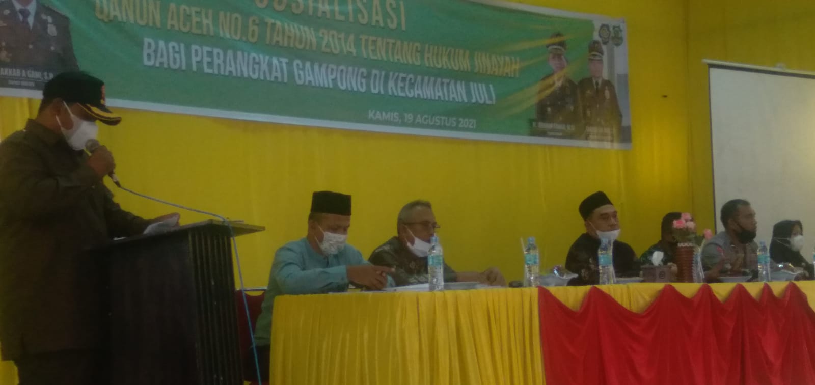 Panitia pelaksana, Lidia Wati, SH menyebukan sosialisasi Qanun Aceh No 6 tahun 2014 tentang qanun jinayah bagi perangkat gampong yang dilaksanakan di 12 kecamatan, dan sekolah SMA sederajat. Kegiatan yang dilaksanakan Pemkab Bireuen melalui Satuan Polisi Pamong Praja dan Wilayatul Hisbah yang Kali ini, giliran perangkat Gampong di Juli yang mendapatkan pemahaman tentang Qanun Jinayah. Sosialisasi ini, setidaknya diikuti 100 peserta, baik kaum pria maupun wanita, berlangsung selama satu hari. Sedangkan pemateri yang dihadirkan salah seorang hakim Mahkamah Syariah Bireuen, DR Jakfar, SH, MH dan Panitera Muda Mahkamah Syariah Bireuen, Mahmuddin, S.Ag.