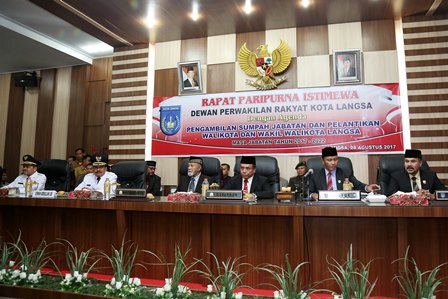 LANGSA | BN – Gubernur Aceh drh Irwandi Yusuf M.Sc dalam sambutan singkatnya, pada Sidang Paripurna Istimewa DPR Kota Langsa, usai melantik dan mengambil sumpah jabatan Tgk Usman Abdullah dan Marzuki Hamid sebagai Wali Kota dan Wakil Wali Kota Langsa, Senin (28/8/2017).