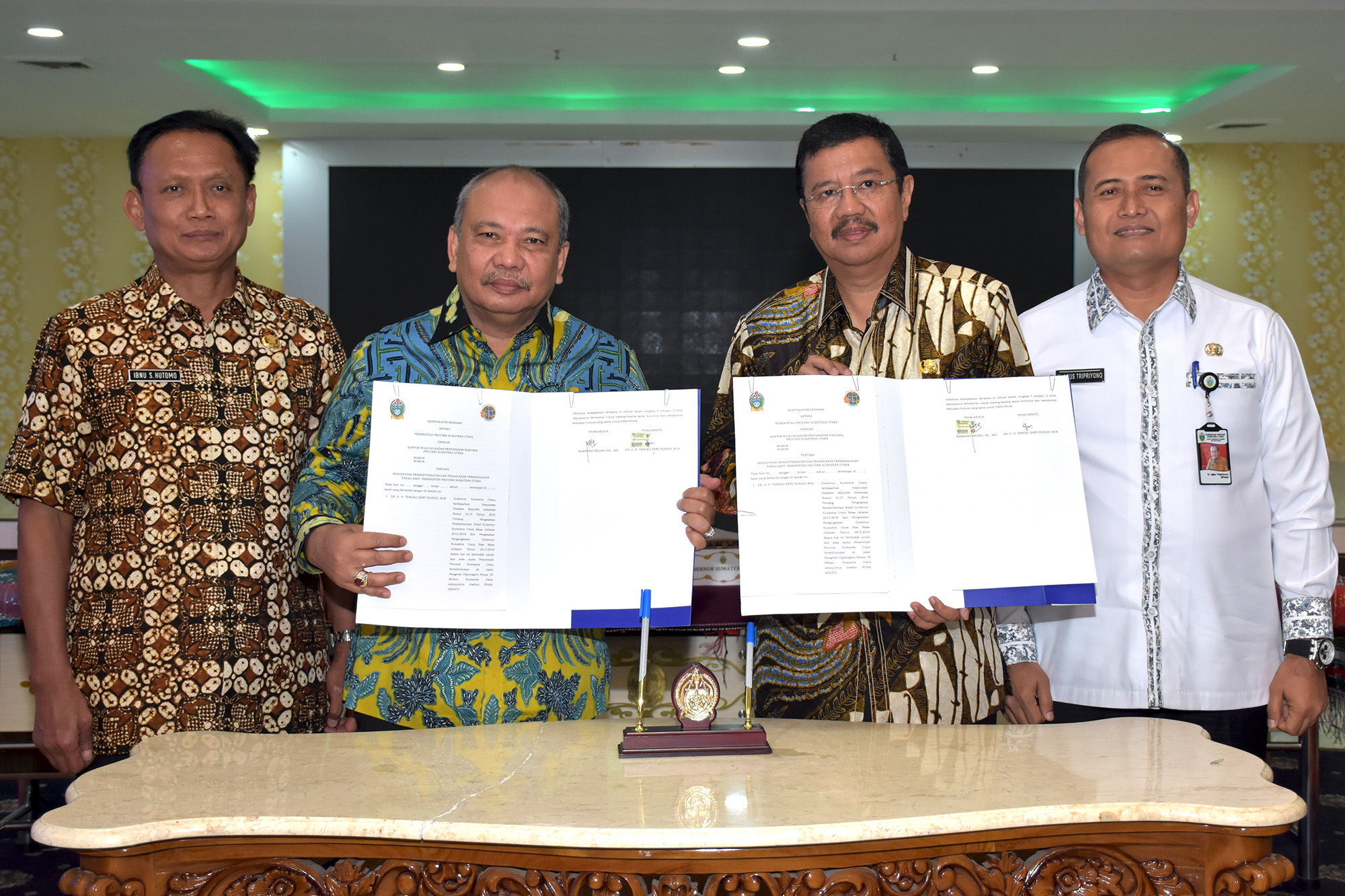 Medan | Bongkarnews.com- Gubenur Sumatera Utara (Gubsu) Dr Ir HT Erry Nuradi MSi dan Kepala Badan Pertanahan Nasional (BPN) Sumatera Utara (Sumut) Bambang Priyono menandatangani Nota Kesepahaman atau MoU tentang percepatan pensertifikatan tanah milik Pemerintah Provinsi Sumatera Utara (Pemprovsu), Jumat (25/5) di Aula Raja Inal Siregar, lantai 2 Kantor Gubsu, Jalan Diponogoro Medan.