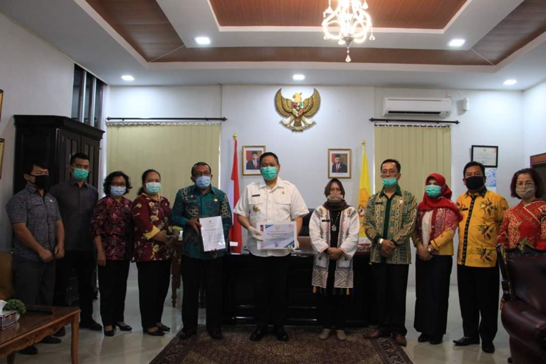 Seraya menyerahkan piagam penghargaan, kunjungan Tim ini juga dalam rangka pembahasan pedoman penerapan new normal produktif yang aman dari penyebaran Covid-19 yang dilaksanakan di Ruang Kerja Bupati Dairi, Kamis (18/06/2020).