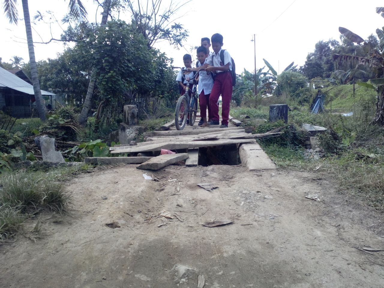 Dia menambah lagi, selama jembatan tersebut rusak kami sudah lima kali membuat jembatan darurat dan jembatan darurat yang kami buat cuma bisa lewat kenderaan roda dua, sedangkan roda empat tidak bisa lewat.