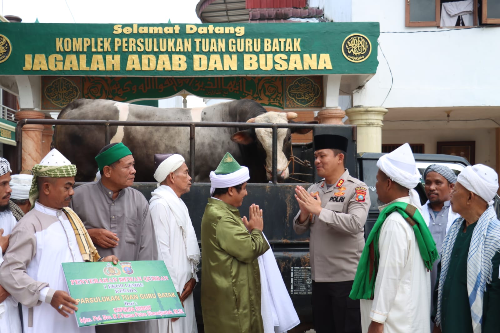 “Saya mewakili Bapak Kapolda Sumatera Utara Bapak Irjen. Pol. Drs. R.Z. Panca Putra S., M.Si., datang kepersulukan Tuan Guru Batak, untuk menyerahkan satu ekor hewan kurban, agar nanti dapat diserahkan atau disalurkan oleh Tuan Guru kepada warga masyarakat yang sudah ditentukan oleh Tuan Guru.
