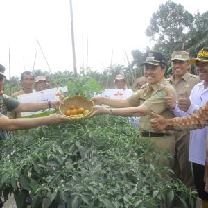 SIAK (BN)- Dalam rangka memotifasi dan meningkatkan hasil pertanian di Kampung Temusai, Kecamatan Bungaraya, Bupati Siak H.Syamsuar dan Danrem 031/Wirabima Brigjen Edy Nasution, di dampingi Wakil Bupati Siak H.Alfedri, Dandim 0303 Bengaklis Letkol (Inf) Rizal Faizal Helmi, Wakapolres Siak, Kepala Pengadilan Negeri Siak Abdul Kodir, Kejari Siak, Kepala Dinas, Kapolsek, Bungaraya Camat,Camat Sungai Apit, Penghulu Kampung, PPL, dan Kelompok Tani Temusai melakukan kegiatan panen raya Tomat di RT 01 RW 05 Dusun Teluk Mussahab, Kampung Temusai. Senin (28/01/2018).