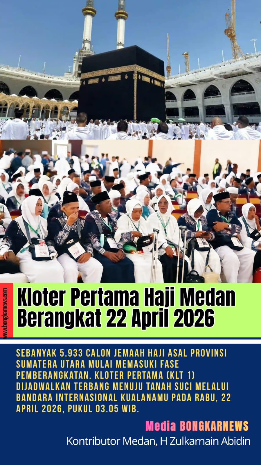 MEDAN BONGKARNEWS – Sebanyak 5.933 calon jemaah haji asal Provinsi Sumatera Utara mulai memasuki fase pemberangkatan. Kloter pertama (KLT 1) dijadwalkan terbang menuju Tanah Suci melalui Bandara Internasional Kualanamu pada Rabu, 22 April 2026, pukul 03.05 WIB.
