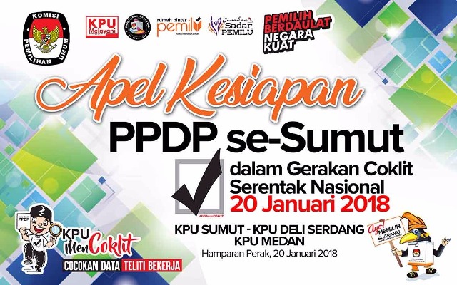 Medan,BN- Apel kesiapan coklit serentak nasional berlangsung di Sumut besok, Sabtu (20/1/2018),di lapangan sepakbola Klambir 5 Hamparan Perak, Deliserdang. Kegiatan yang dilaksanakan KPU Sumut itu akan dihadiri anggota KPU RI Evi Novita Ginting.