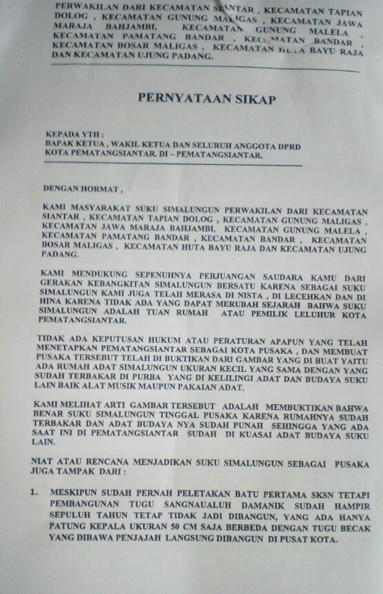 Dalam surat tuntuan masa tertuluis beberapa tuntutan diantaranya, yang mana sesuai dengan sejarah panjang perjalanan suku Simalungunlah sebagai leluhur dan juga tuan rumah bagi kota Pematang Siantar, dan soal tugu Sangnaualuh Damanik yang telah berjalan sepuluh tahun namun belum berdiri yang ada hanya patung kepala berukuran 50 CM.