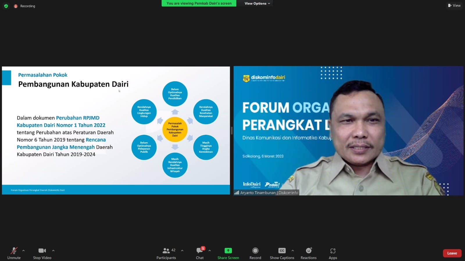 DAIRI | bongkarnews.com – Dinas Komunikasi dan Informatika (Diskominfo) Kabupaten Dairi menyelenggarakan Forum Organisasi Perangkat Daerah, Senin (06/03/2023). Acara ini dibuka Sekretaris Daerah Kabupaten Dairi, Budianta Pinem melalui daring.