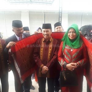 Sementara itu di dalam gedung, kelompok gondang sembilan, meningkah langkah kaki Syamsuar bersama istri hingga duduk pada kursi yang sudah disiapkan. Hari itu, Syamsuar mengenakan pakaian dengan motif ”batik” khas nasution.