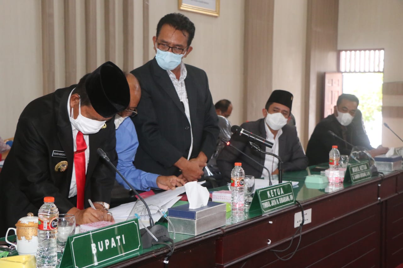 Penandatangan tersebut langsung dilakukan oleh Bupati Simalungun Radiapoh Hasiholan Sinaga SH dan Ketua DPRD Timbul Jaya Sibarani SH MH bersama wakil-wakil ketua Samrin Girsang SPd dan Elias Barus SE pada rapat paripurna DPRD Simalungun yang dipimpin oleh Ketua DPRD, bertempat di gedung DPRD, Pamatang Raya, Sumut, Jum’at 3/9/2021.