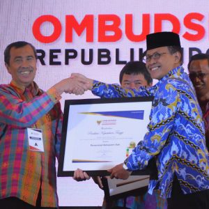 Jakarta(BN)Pemerintah Kabupaten Siak mendapat predikat Implementasi Kepatuhan Tertinggi dari Ombudsman Republik Indonesia. Penghargaan itu diberikan dalam acara penganugerahan predikat kepatuhan terhadap standar pelayanan publik yang diterima langsung oleh Bupati Siak H Syamsuar yang didampingi Kepala Dinas Penanamanm modal dan pelayanan terpadu satu pintu Heriyanto SH di Balai Kartini, Jalan Gatot Subroto, Jakarta Selatan, Selasa (5/12/2017).