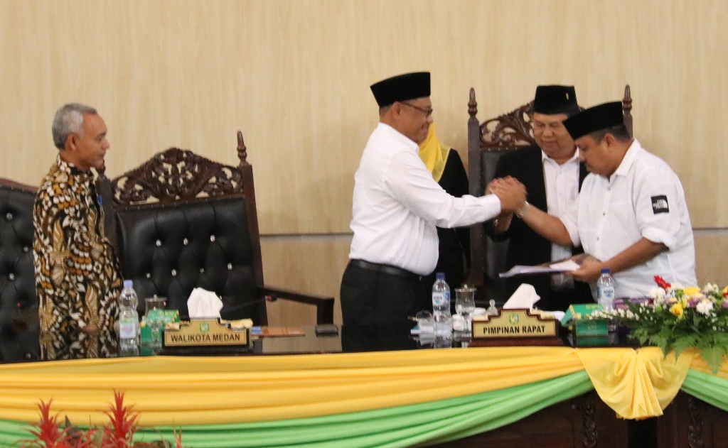Demikian Nota Jawaban Wali Kota Medan Drs H T Dzulmi Eldin S MSi MH yang dibacakan Wakil Wali Kota Medan Ir H Akhyar Nasution MSi menanggapi Pemandangan Umum Fraksi PDI Perjuangan yang disampaikan Boydo Panjaitan SH pada Sidang Paripurna DPRD Medan tentang Laporan Pertanggungjawaban Pelaksanaan Anggaran Pendapatan Belanja Daerah (APBD) Kota Medan Tahun Anggaran 2018 di Gedung DPRD Medan, Jumat (28/6).