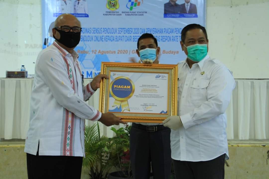 DAIRI | bongkarnews.com – Bupati Dairi Eddy Keleng Ate Berutu menerima penghargaan dari Gubernur Sumatera Utara dan Kepala BPS RI sebagai Kabupaten Pencapaian Sensus Penduduk (SP) Online (Respon Melebihi Target) tertinggi se-Sumatera Utara yang diserahkan oleh Kepala BPS Provinsi Sumatera Utara. Piagam tersebut diterima langsung oleh Bupati Dairi, Eddy Keleng Ate Berutu, Rabu (12/8/2020) di Balai Budaya Sidikalang, Kabupaten Dairi.