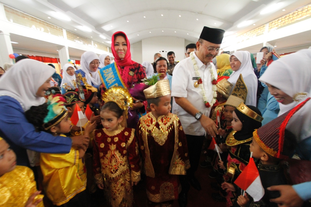 Medan,BN- Walikota Medan Drs. H T Dzulmi Eldin S, M.Si bersama Ketua TP PKK Kota Medan Hj. Rita Maharani Dzulmi Eldin yang juga merupakan Bunda PAUD Kota Medan memperingati Hari Anak Nasional Tahun 2017 Kota Medan Medan, Selasa (29/8) di Aula Madinatul Hujjaj Asrama Haji Medan.