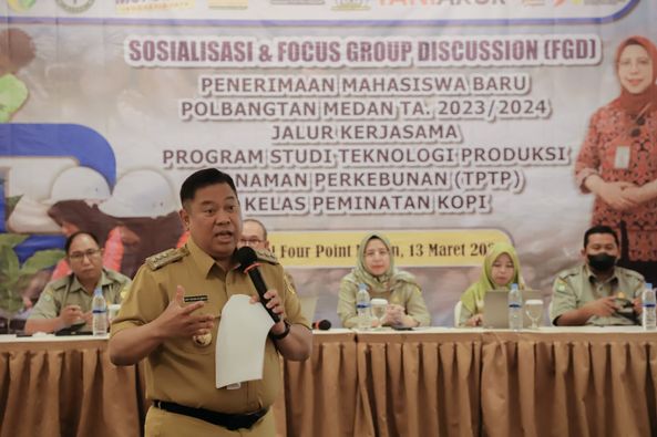 DAIRI | bongkarnews.com – Guna pengembangan pertanian secara khusus tanaman kopi, Politeknik Pembangunan Pertanian (Polbangtan) Medan menyelenggarakan sosialisasi dan Focus Group Discussion (FGD) dalam rangka penerimaan mahasiswa baru Tahun Akademik 2022-2023, bertempat di Hotel Four Point Medan, Senin (13/03/2023). FGD ini merupakan sosialisasi Polbangtan Medan dalam rangka pembukaan program studi baru yaitu peminatan kopi.
