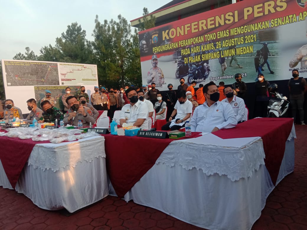 MEDAN | bongkarnews.com – Kapolda Sumatera Utara Irjen Pol R.Z Panca Putra Simanjuntak, didampingi Wakapolda Sumatera Utara Brigjen Pol Dadang Hartanto, dan Kapolrestabes Medan Kombes Pol Rico Sunarko, melaksanakan Konfrensi pers mengungkap Perampokan Toko Emas dengan menggunakan senjata api di halaman Polda Sumatera Utara. Konferensi pers ini dihadiri oleh Bapak Wali Kota Medan Bobby Nasution dan Pangdam 1 Bukit Barisan Mayjen TNI Hassanudin.