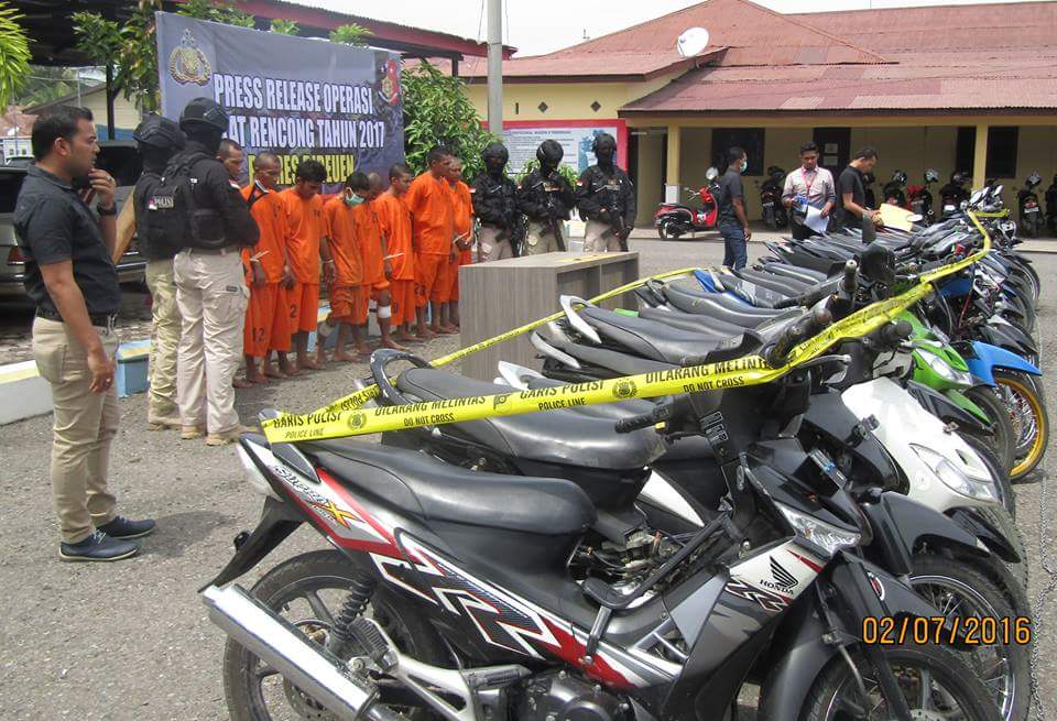 BiREUEN[BN-Polres Bireuen berhsil membongkar pencuarian kendaraan bermotor (Cunramor) dalam Operasi Sikat Rencong 2017. Dalam Operasu tersebut berhasil’diamankan 11 tersangka, tiga diantaranya merupakan penadah asal Kebupaten Aceh Utara.