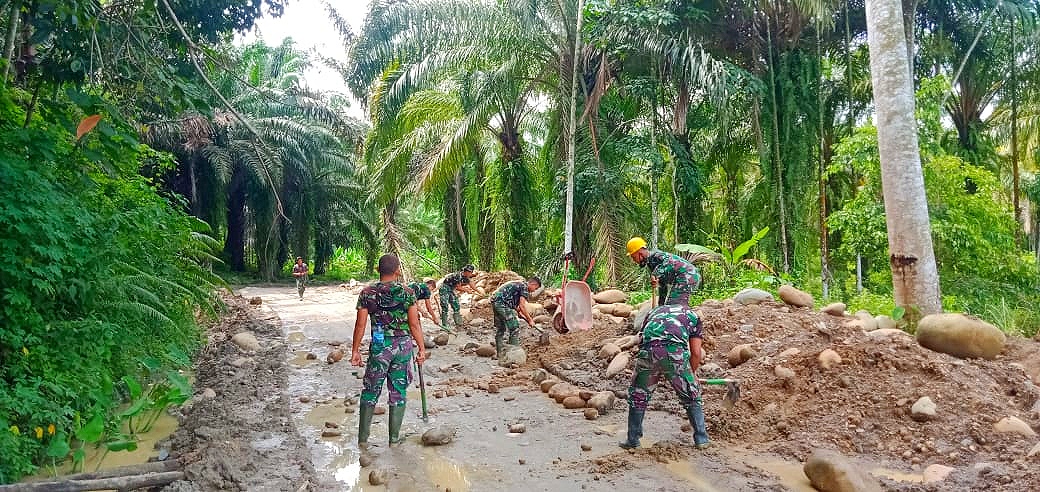 Salah seorang personel Satgas mengaku, pekerjaan memantapkan permukaan badan jalan ini akan terus mereka lakukan sampai benar-benar aman untuk dilalui warga nantinya.