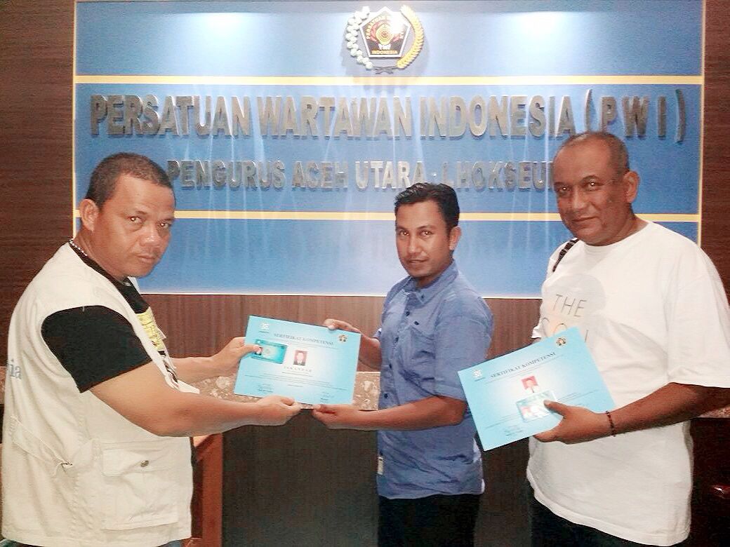 LHOKSEUMAWE | BN – Ketua Persatuan Wartawan Indonesia (PWI) Aceh Utara-Lhokseumawe, Sayuti Achmad menyerahkan sertifikat dan kartu Uji Kompetensi Wartawan (UKW) Muda kepada sejumlah pengurus organisasi tertua di Indonesia ini. Penyerahan kartu dan sertifikat secara simbolis itu berlangsung di kantor PWI, Kamis (24/8).