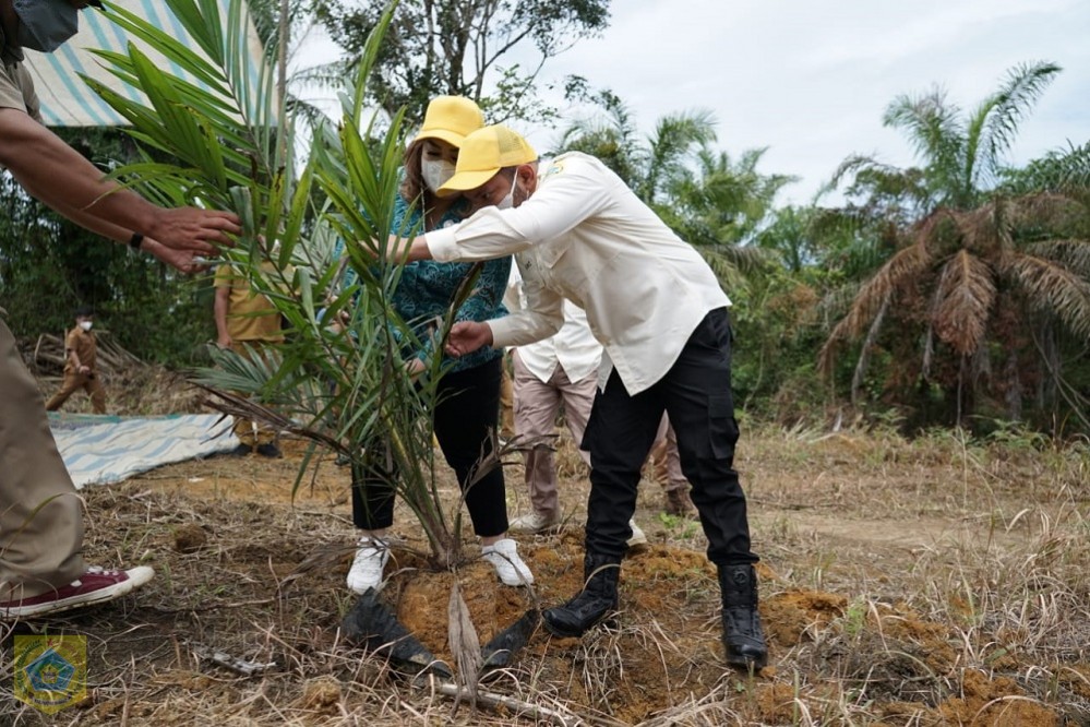Bupati Pakpak Bharat, Franc Bernhard Tumanggor bersama istri yang juga merupakan Ketua TP PKK Pakpak Bharat, Ny. Juniatry Franc Tumanggor turut serta menanam tanaman sawit dilahan yang luas yang terhampar di Desa ini.