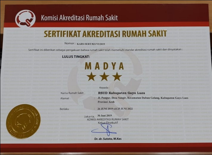 Disebutkan akreditasi sepatutnya dilakukan penilaian ulang selama 3 tahun sekali. Namun atas tekad bersama, RSUD Kabupaten Gayo Lues memacu akreditasi. Belum sampai pada tahun ketiga, sudah dilakukan penilaian oleh Komite Akreditasi Rumah Sakit.