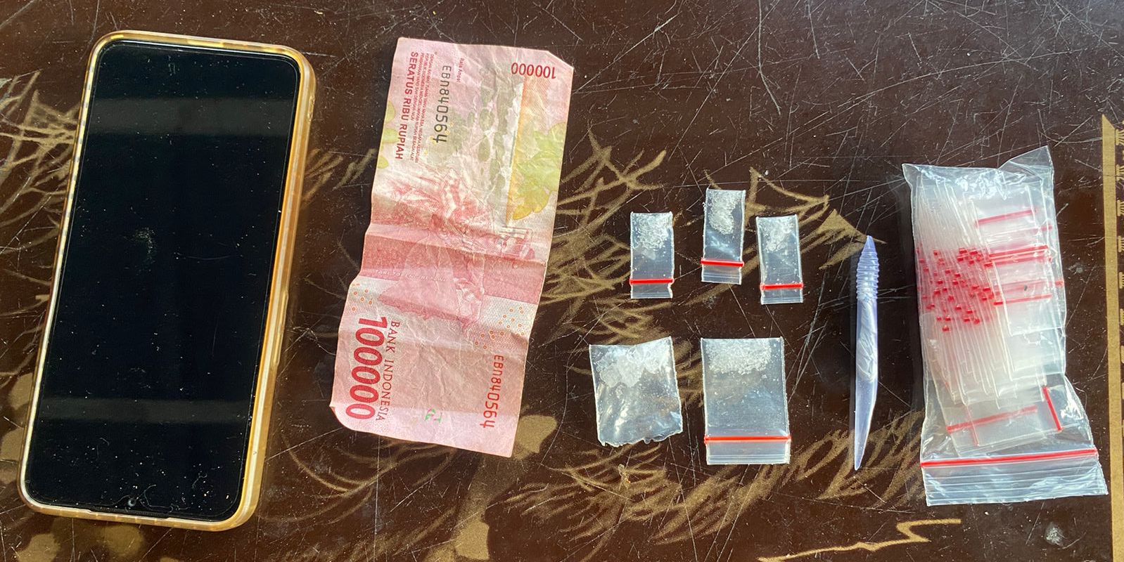 Dari “SP”(33) Team berhasil menemukan barang bukti berupa 5 (lima) bungkus plastik klip transparan yang didalamnya berisi diduga narkotika jenis sabu-sabu dengan berat brutto 1,77 gram., Uang sejumlah Rp. 100.000,- 1 (satu) pipet plastik, 1 (satu) unit HP Android Merk Realme dan 1 (satu) bal plastik klip kosong.
