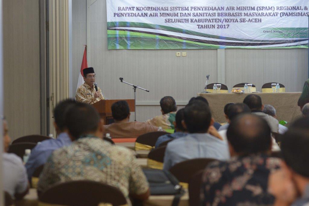 BANDA ACEH | BN – Sekretaris Daerah Aceh, Drs. Dermawan, MM yang diwakili Asisten Bidang Ekonomi dan Pembangunan, Drs. Syaiba Ibrahim membuka Rapat Koordinasi Sistem Penyediaan Air Minum (SPAM) Regional dan Program Penyediaan Air Minum dan Sanitasi Berbasis Masyarakat (PAMSIMAS) se- Aceh di hotel Grand Nanggroe, Kamis (24/08/17).
