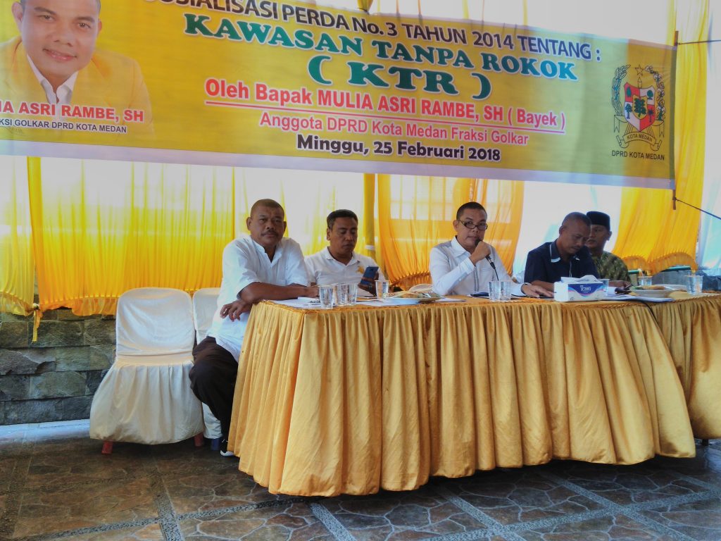 Hal itu diungkapkan anggota DPRD Kota Medan dari Fraksi Partai Golkar, Mulia Asri Rambe, pada sosialisasi Perda Kota Medan No. 3 tahun 2014 tentang Kawasan Tanpa Rokok (KTR) yang dilaksanakannya, Minggu (25/2/2018).