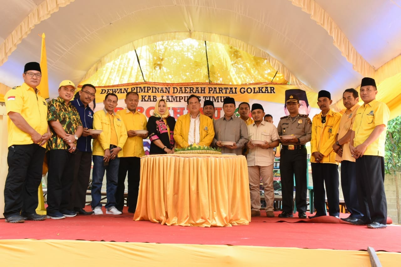 Usai sambutan, acara dilanjutkan dengan pemotongan tumpeng oleh Ketua DPD II Partai Golkar Kabupaten Lampung Timur, Azwar Hadi, serta pemberian santunan kepada 21 anak yatim piatu dan piagam kepada tokoh Partai Golkar.(Tarmizi)