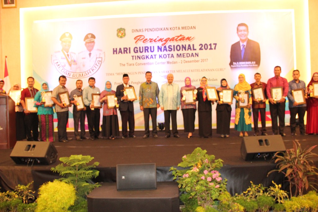 Medan,BN- Wali Kota Medan Drs H T Dzulmi Eldin S MSi menyerahkan pengharaan kepada 20 orang guru, kepala sekolah dan pengawas sekolah mulai tingkat SD sampai SMP di Kota Medan. Penghargaan ini diberikan pada acara Peringatan Hari Guru Nasional Tingkat Kota Medan di The Tiara Convention Centre Medan, Sabtu (2/12).