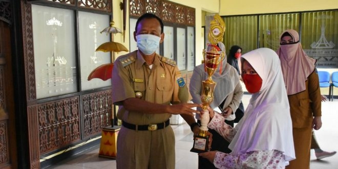 METRO I bongkarnews.com- Walikota Metro , Achmad Pairin menyerahan piala bergilir Lomba Olimpiade Walikota CUP LKP Airlangga, di Halaman Sekretariat Daerah Kota Metro, Selasa (21/07/2020).