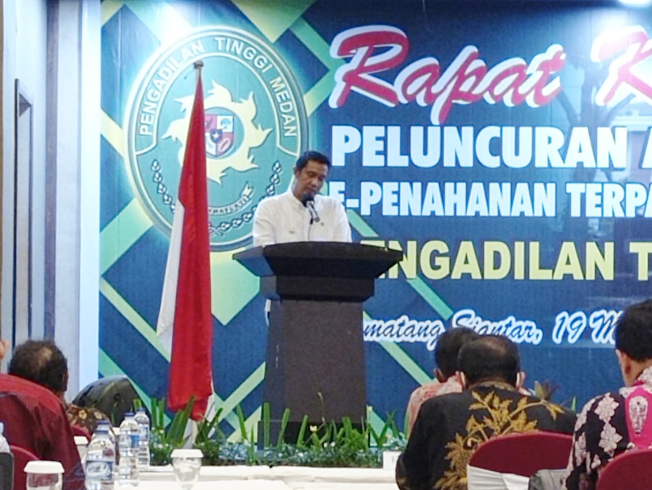 Walikota Pematangsiantar Dr H Hefriansyah SE MM dalam sambutannya mengucapkan terima kasih kepada PT Medan yang telah berkenan menjadikan Kota Pematangsiantar menjadi tuan rumah kegiatan Rakor PT Medan dengan Ketua PN se-Sumut dan peluncuran aplikasi E-Penahan Terpadu V3.3 dan E-Petikan PT Medan.