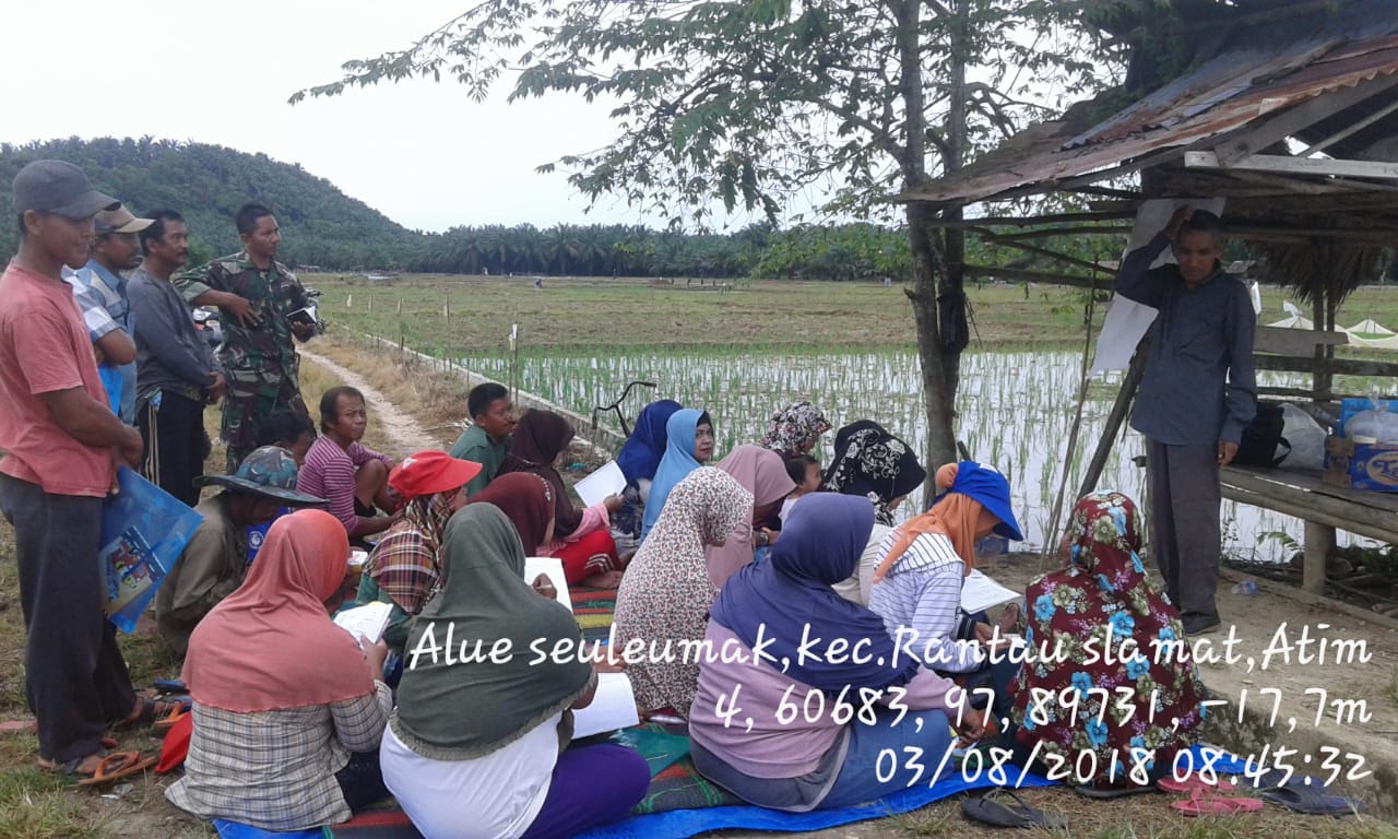ACEH TIMUR | bongkarnews.com – Sersan satu Abdul Hakim anggota Koramil 03/RTS Kodim 0104/Atim melaksanakan pendampingan Sekolah Lapangan yang diselenggarakan oleh BPP (Badan Penyuluhan Pertanian) kepada para petani desa binaannya bertempat di desa Alue seuleumak Kecamatan Rantau Selamat Kab Aceh Timur, Jumat(03/08/2018).