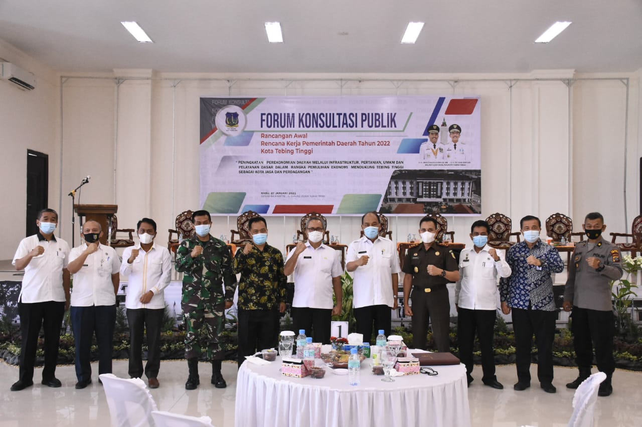Tebing Tinggi i bongkarnews.com-Pemerintah Kota (Pemko) Tebing Tinggi mengadakan kegiatan Forum Konsultasi Publik Rancangan Awal Rencana Kerja Pemerintah Daerah (RKPD) Kota Tebing Tinggi Tahun 2022 bertempat di Gedung Balai Pertemuan Kartini Kota Tebing Tinggi, Rabu (27/1/2021).