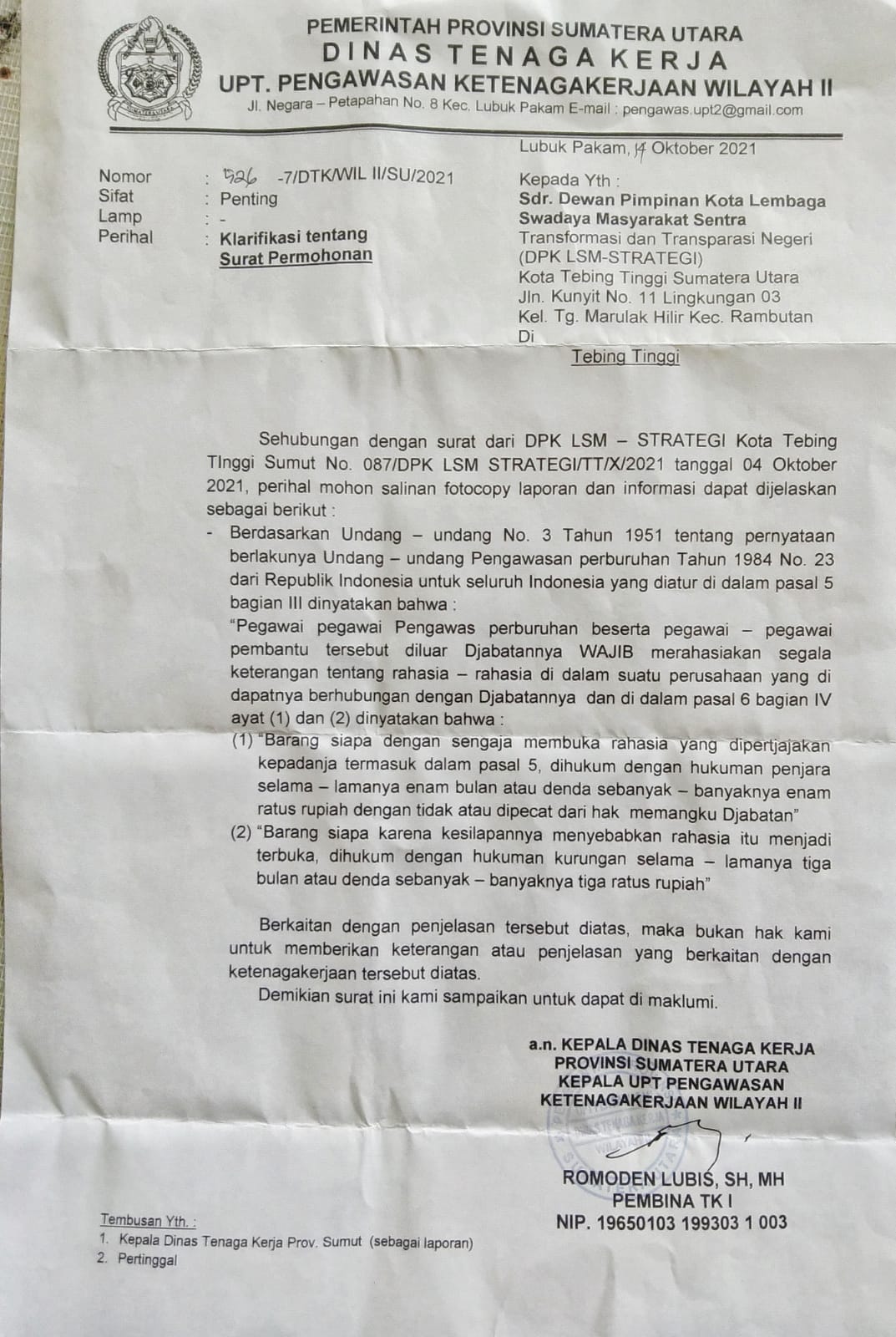 Tebing Tinggi I bongkarnews.com-Diduga berdalih tunduk terhadap Undang No 3 Tahun 1951, pasal 5 bagian III tentang pernyataan berlakunya Undang-Undang Pengawasan Perburuhan, Kepala UPT Pengawasan Ketenagakerjaan Wilayah II Dinas Tenaga Kerja Provinsi Sumatera Utara, Romoden Lubis, tidak mau memberi salinan atau fhotocopy laporan para pengusaha kepada pemohon informasi.