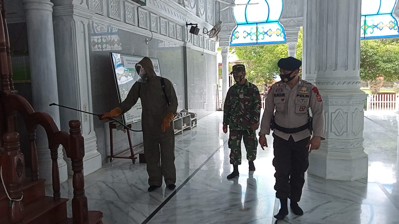Lhokseumawe – Menjelang hari raya Idul Fitri 1442 H Personil Brimob Kompi 1 Batalyon B Pelopor Satbrimob Polda Aceh melakukan penyemprotan disinfektan untuk pencegahan penyebaran covid 19 demi kenyamanan masyarakat dalam beribadah menjelang pelaksanaan shalat Idul Fitri di Mesjid Darul Muhya Desa Buloh Blang Ara Kecamatan Kuta Makmur Kabupaten Aceh Utara.