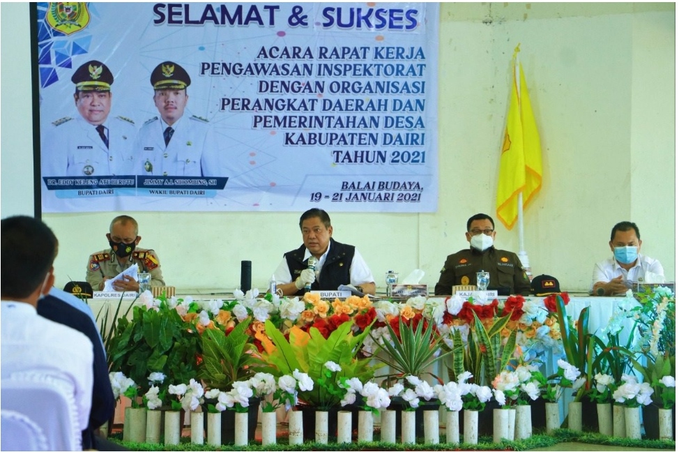 DAIRI | bongkarnews.com – Bupati Dairi Eddy Keleng Ate Berutu hadiri rapat koordinasi Aparat Pengawasan Intern Pemerintah (APIP) bersama dengan para Kepala Desa se-Kabupaten Dairi pada Rabu (20/1/2021) di Gedung Balai Budaya Sidikalang.