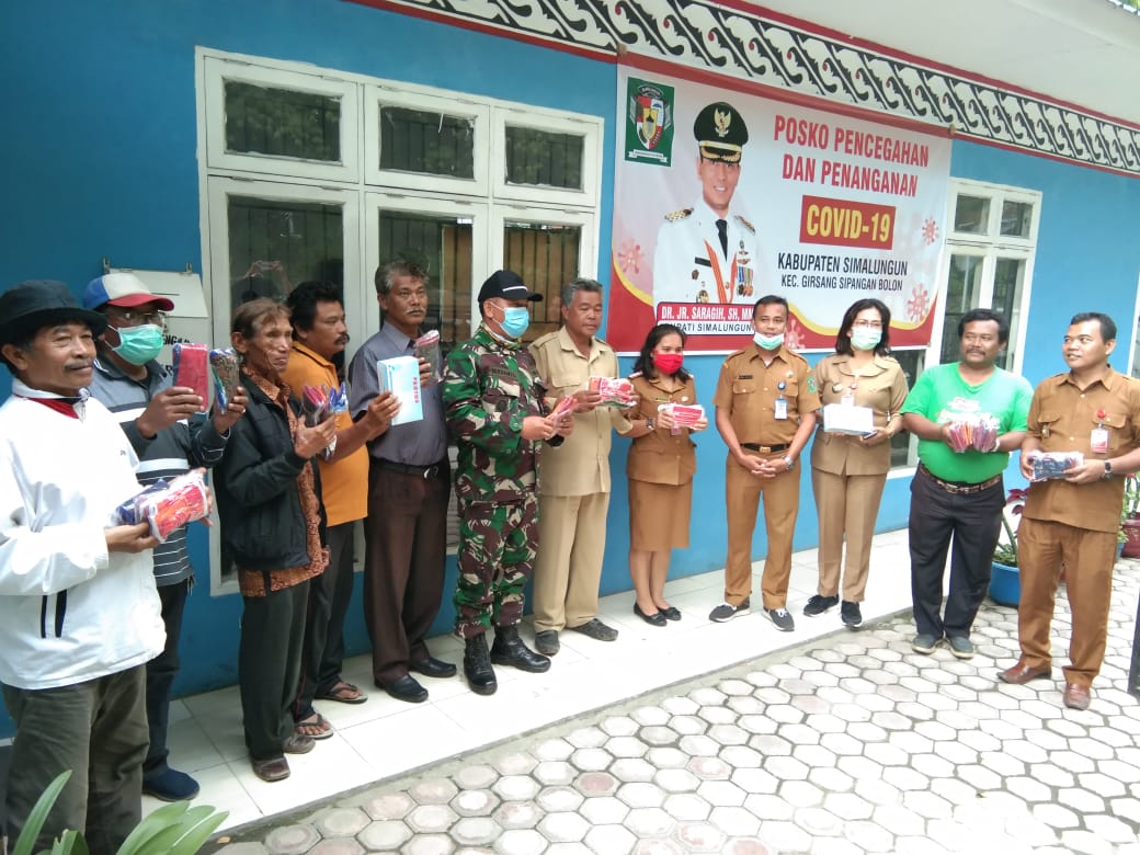 Humas Tim Gugus Percepatan Penanganan Covid 19 kabupaten Simalungun Akmal H Siregar,M.Si usai menyerahkan masker kepada Camat Girsang Sipanganbolon ,Eva Tambunan untuk dibagikan kepada masyarakat melalui para kepala lingkungan (Kepling),mengatakan,pembagian masker kepada masyarakat merupakan upaya memutus rantai penyebaran virus Corona.