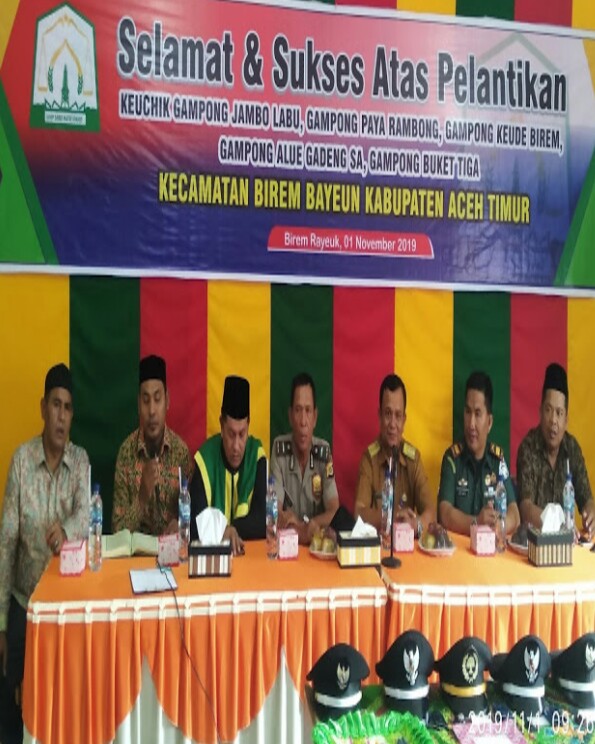 Dalam kata sambutanya Camat Birem Bayeun Jainuddin SE menyampaikan kepada geuchik yang baru di Lantik serta para hadirin yang hadir menyaksikan pelantikan tersebut ucapkan selamat dan selamat bertugas di desanya masing masing. Disamping itu kami tekakan setelah dilantik agar benar benar menjalankan amanah yang sudah di emban pada saudra yang dititipkan melalui masyarakat desanya masing- masing .