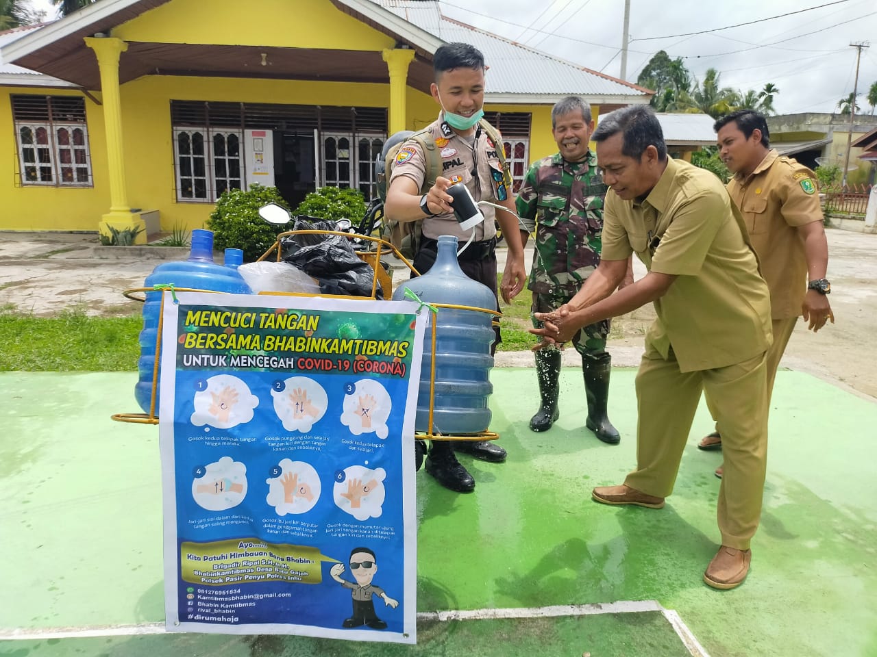 Untuk mengajari warga Bhabinkamtibmas sengaja memodifikasi sepeda motor dinasnya agar mampu membawa galon berisi air untuk mengajari warga cara mencuci tangan yang baik dan benar.