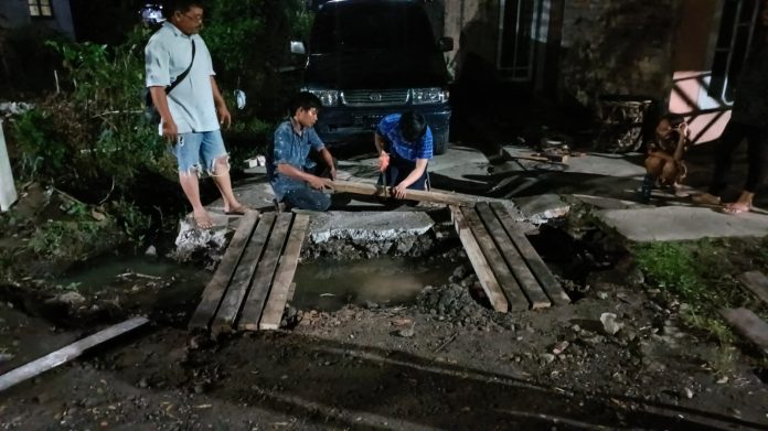 Bahkan warga terpaksa memasang papan untuk membuat titi agar bisa dilalui kendaraan.