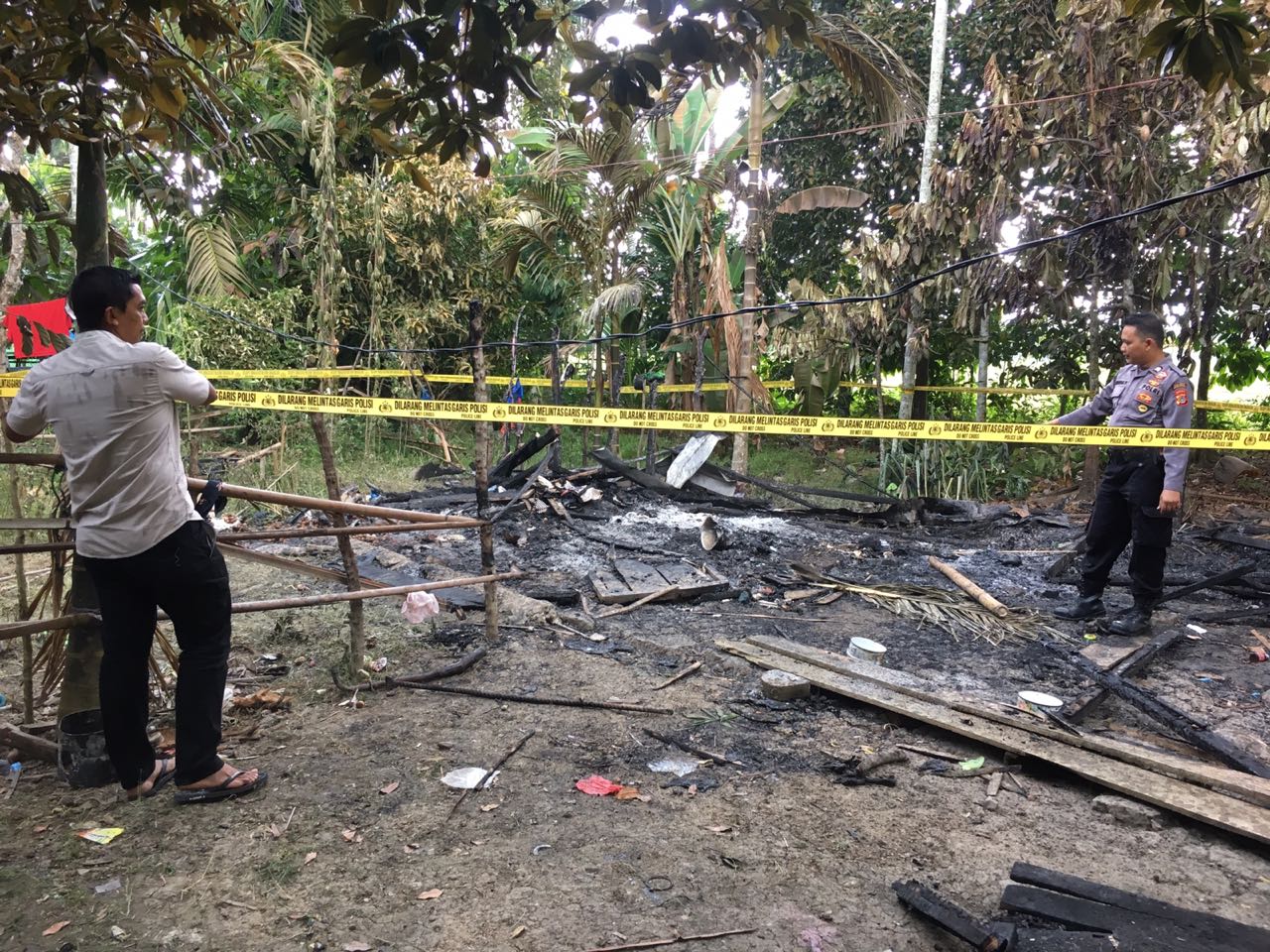 FOTO : Polisi sedang mengamati kondisi rumah korban yang sudah hangus dilalap api. (SJ)