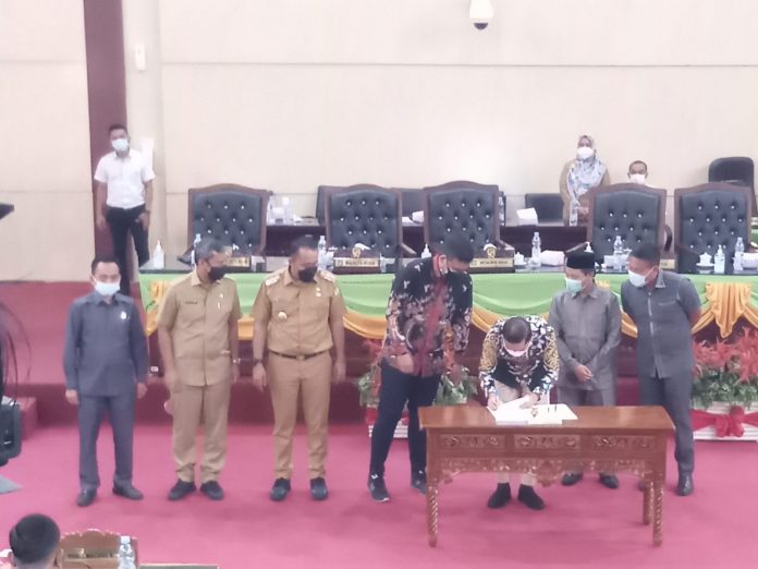 Persetujuan dilakukan dengan penandatanganan pengambilan keputusan bersama pimpinan DPRD Medan dengan Walikota Medan Bobby Afif Nasution saat rapat paripurna dewan di gedung dewan Jalan Kapten Maulana Lubis Medan, Senin (09/08/2021). Rapat dipimpin Wakil Ketua DPRD Medan H Ihwan Ritonga, Rajudin Sagala dan HT Bahrumsyah dan dihadiri sejumlah pimpinan alat kelengkapan dewan (AKD) serta Plt Sekwan DPRD Medan Erisda Hutasoit.