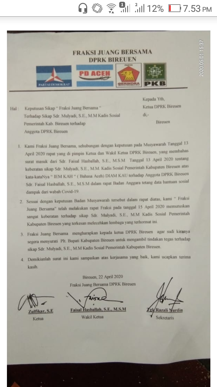 Dalam poin dua surat itu juga dinyatakan dalam keputusan musyawarah antar sesama anggota DPRK Bireuen Fraksi Juang Bersama pada tanggal 15 April 2020 mengambil sikap sangat keberatan terhadap action Kadis Sosial Mulyadi SE MM yang terkesan sangat menyepelekan keberadaan wakil rakyat dalam pemerintahan.